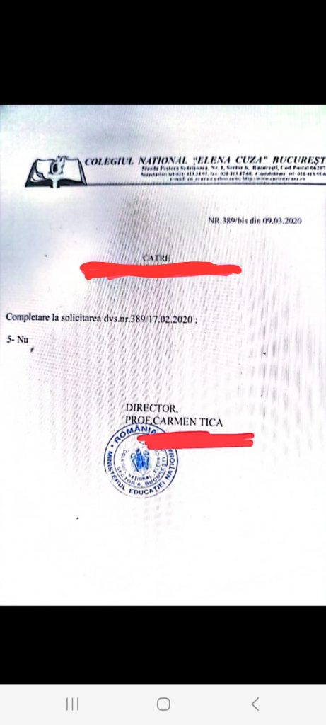 In adresa de raspuns 389bis/09.03.2020, Colegiul National ''Elena Cuza'' Bucuresti, intrebati fiind daca au sesizat vreodata D.G.A.S.P.C. sector 6, au raspuns monosilabic: ''NU''. Raspunsul a fost semnat de director TICA CARMEN. Vezi dovezi in subsolul paginii