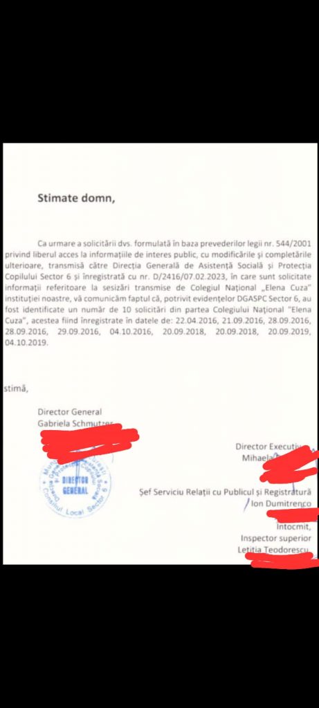 D.G.A.S.P.C. sector 6, ne-a informat cu privire la faptul ca, unitatea de invatamant Colegiul National ''Elena Cuza'' Bucuresti, a sesizat Directia Generala si Sociala de Protectie a Copilului, de 10 ori, in perioada 22.04.2016 - 04.10.2019.