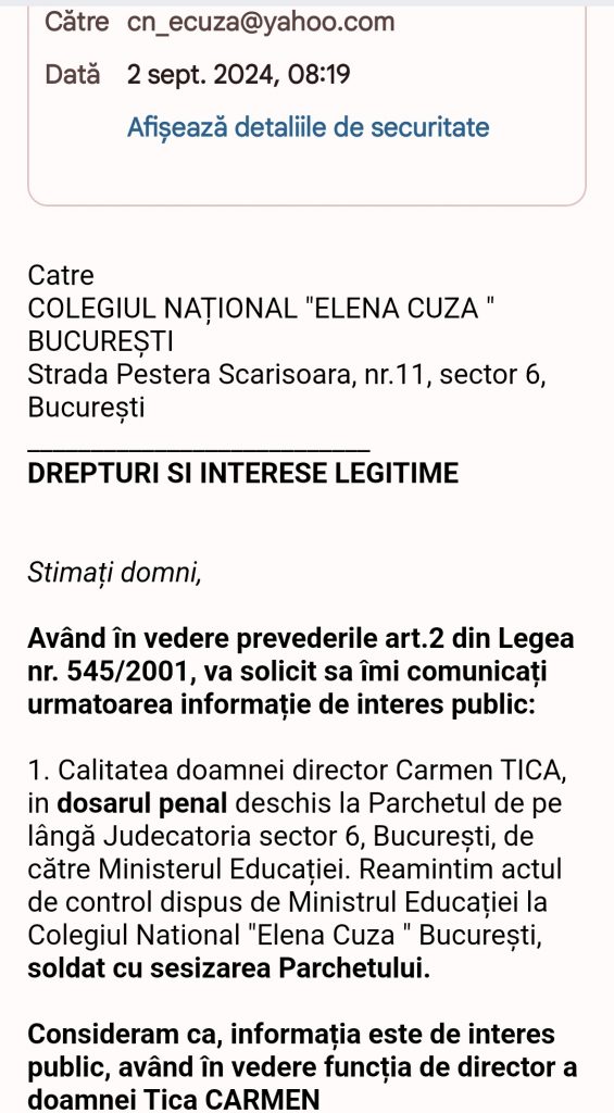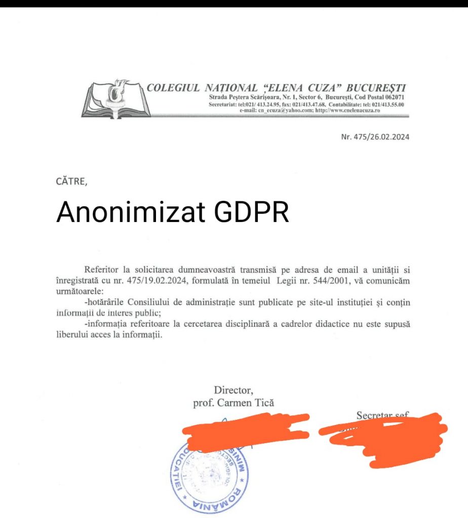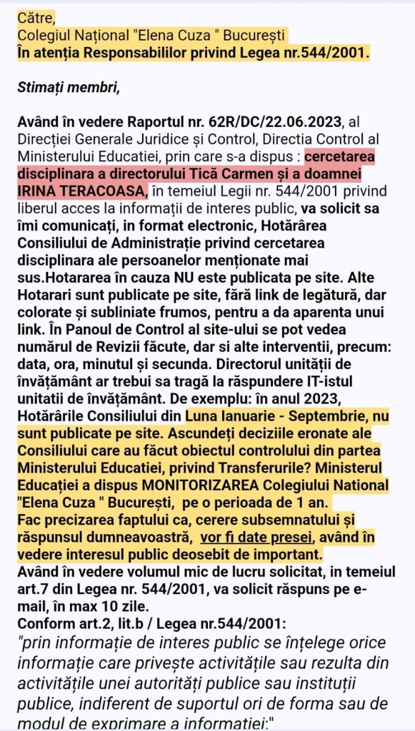 Cerere catre Colegiul National ''Elena Cuza'' Bucuresti. Directorul Tica Carmen, sustine faptul ca: '' cercetarea cadrelor didactice, nu reprezinta informatie de interes public''