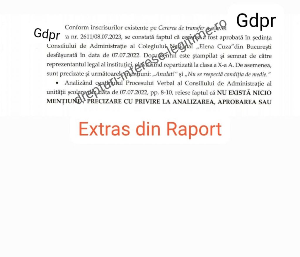 Mai jos, puteti vedea o cerere de transfer ''aprobata'' de Consiliul de Administratie al Colegiului National ''Elena Cuza'' Bucuresti, si 2 ore mai tarziu au anulat-o (!). Probabil, mama elevei, nu a dat ''o atentie''. De aici a pornit actul de control din partea Directiei Generale Juridice si Control, din cadrul Ministerului Educatiei.