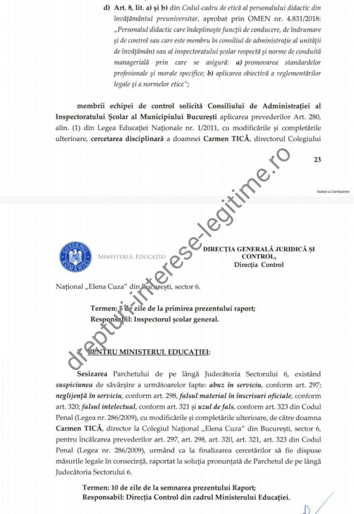 In urma controlului efectuat la Colegiul National ''Elena Cuza'' Bucuresti, de catre Directia General Juridica si Control, din cadrul Minsterului Educatiei, acestia au constatat o serie de nereguli. Potrivit Raportului intocmit de catre Directia Generala Juridica si Control, directorul Tica Carmen, a comis tot felul de falsuri in inscrisuri oficiale, cu privire la transferul mai multor elevi. Vom reveni cu amanunte