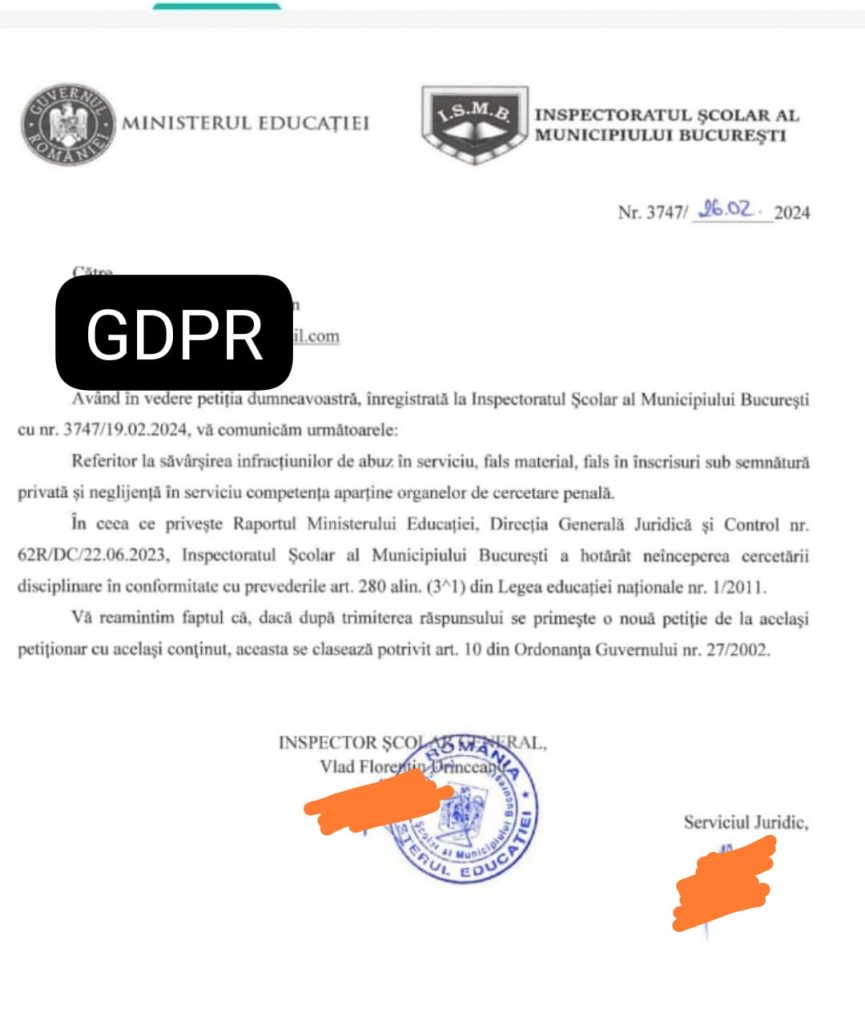 O persoana fizica a solicitat ISMB, sa comunice daca s-au dispus masuri disciplinare impotriva directorului Colegiului National ''Elena Cuza'' Bucuresti, Tica Carmen. Desi Corpul de Control al Ministerului Educatiei a constatat 5 suspiciuni de fapte penale, comise de directorul Tica CARMEN, ISMB nu a luat masuri. Mai mult, Vlad Florentin DRINCEANU, face confuzie intre Legea nr. 544/2001 si OG nr.27/2002, in sensul ca acesta a ''amenintat'' petitionarul cu art. 10 din OG nr.27/2002, daca indrazneste sa revina cu petitie pe Legea 544. Raspunsul ISMB semnat de Inspectorul Scolar General, Vlad Florentin DRINCEANU, il puteti vedea mai jos. Vom vedea daca ISMB minte sau spune adevarul. Intre timp, Colegiul National ''Elena Cuza'' Bucuresti, a ascuns publicului Hotararile Consiliului de administratie, care vizeaza speta constatata de catre Corpul de Control al Ministerului Educatiei.