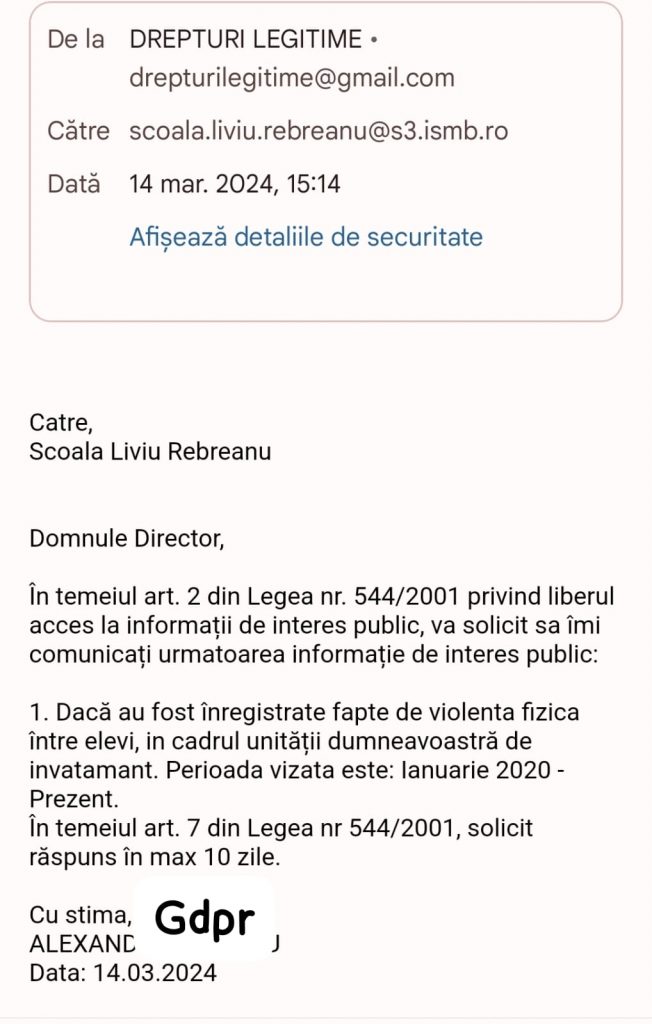 La data de 14 martie 2024, o persoana fizica a solicitat informatii publice, de la Scoala Liviu Rebreanu, in conformitate cu prevederile art. 2 din legea nr. 544/2001.