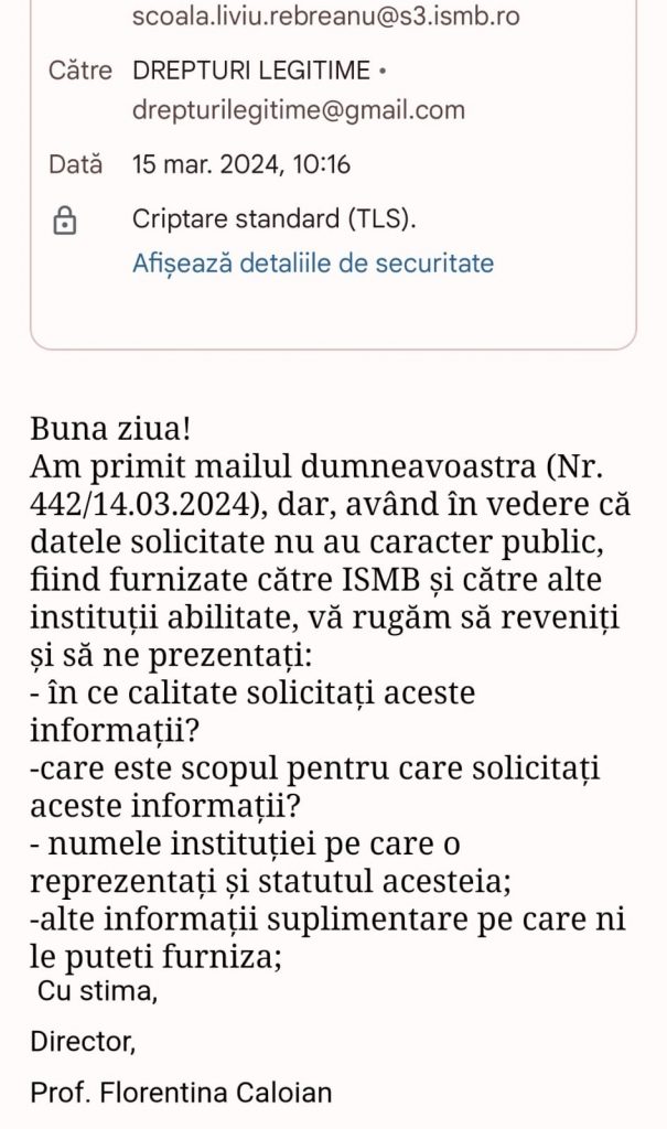 La data de 15 martie 2024, directorul scolii, Florentina Caloianu, a raspuns petitionarului, intr-un mod total eronat si nedocumentat. Aceasta a intrebat petitionarul ''cine sunteti''?, desi acesta s-a prezentat. Directoarea Caloianu a mai intrebat petitionarul ''in ce calitate solicitati informatiile''?, desi legea nr. 544/2001 privind liberul acces la informatii de interes public, este clara. Directorul Florentina CALOIANU, a mai intrebat petitionarul ''care este scopul pentru care solicitati aceste informatii''?, in mod evident, situandu-se desupra legii. Iata un Exemplu Negativ de conducator, al unei institutii publice. Vom reveni cu amanunte, dupa sesizarea tuturor organelor competente, de catre persoana vatamata in drepturi si interese legitime.