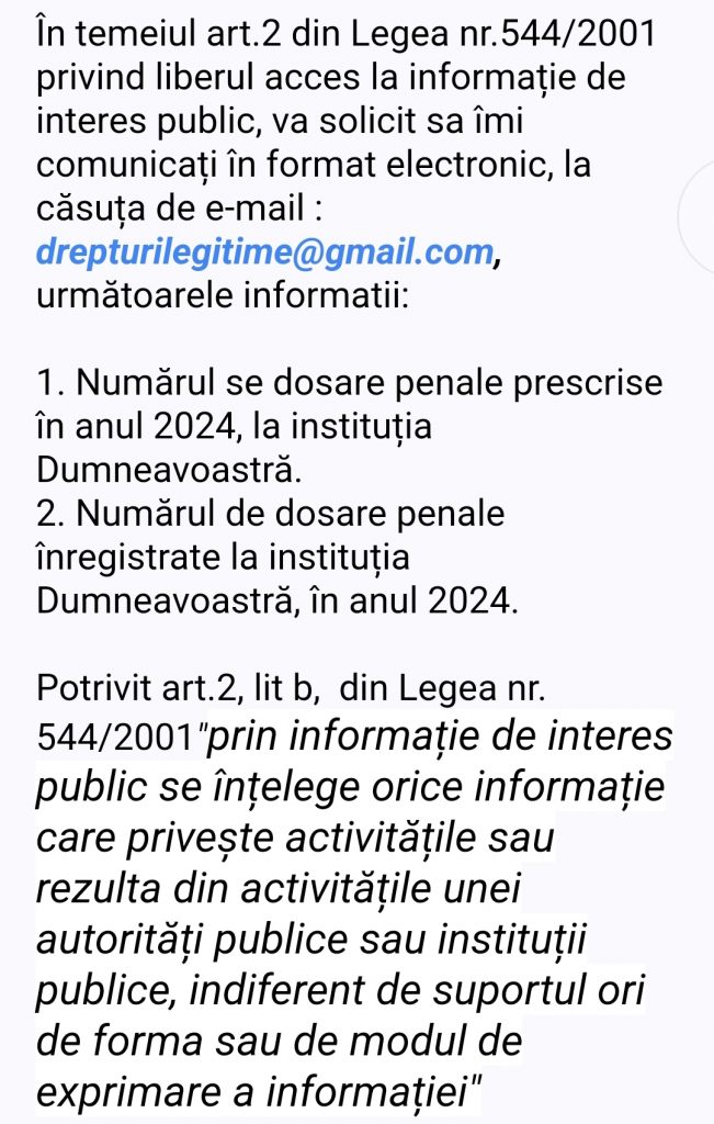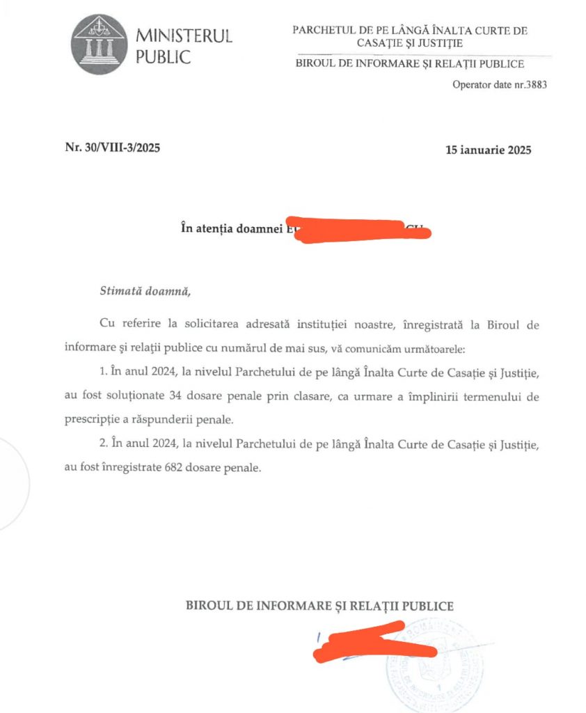 Parchetul de pe langa Inalta Curte de Casatie si Justitie ( fostul PARCHET GENERAL), condus de ALEX FLORENTA, a fost solicitat de catre o persoana fizica, sa comunice numarul de dosare prescrise in anul 2024, dar si numarul de dosare penale inregistrate in anul 2024.