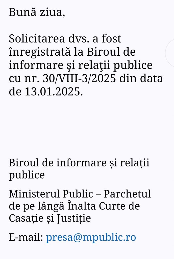 Temeiul legal al solicitarii a fost Legea nr.544/2001, privind liberul acces la informatii de interes public. Solicitarea a fost inregistrata sub numarul 30/VIII-3/2025 din data de 13.01.2025. In termenul legal de 10 zile, prevazut de art.7 din Legea nr.544/2001, urmeaza sa primim raspuns pe care il vom publica aici