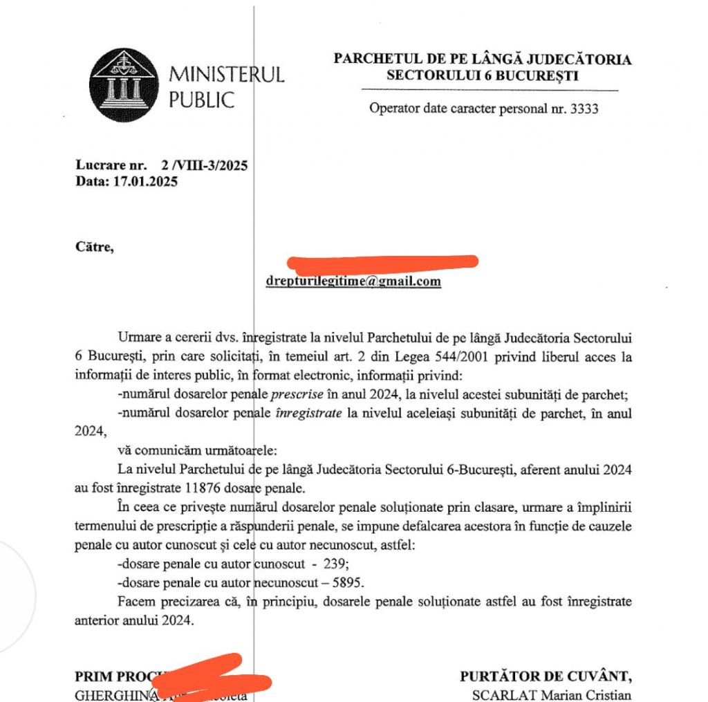 In anul 2024, la Parchetul de pe langa Judecatoria sector 6 Bucuresti, aflat in subordinea Parchetului de pe langa Tribunalul Bucuresti, au fost clasate un numar de 6134 dosare penale, ca urmare a ajungerii la termenul de prescriptie. Din cele 6134 dosare penale, 239 au fost cu autori cunoscuti si 5895 au fost cu autori necunoscuti. Tot in anul 2024, au fost inregistrate la Parchetul de pe langa Judecatoria sector 6 Bucuresti, un numar de 11876 de dosare penale. Motivele clasarii prin ajungerea la termenul de prescriptie, nu il cunoastem, dar promitem ca vom solicita lamuriri de la Parchetul de pe langa Judecatoria sector 6 Bucuresti.